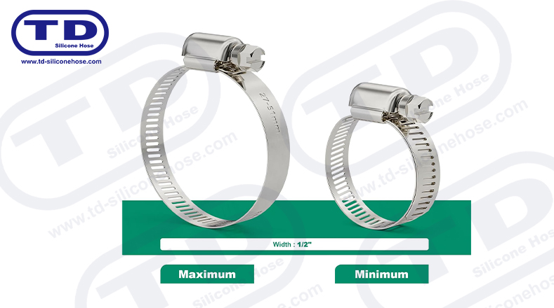 1. Justerbart rækkevidde af slangeklemmen Båndbredde: 12 mm (0,5 "), tykkelse: 0,6 mm (0,024").